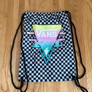 Vans drawstring backpack with vibrant checkered pattern. Features multicolor logo design. Ideal for casual outings.