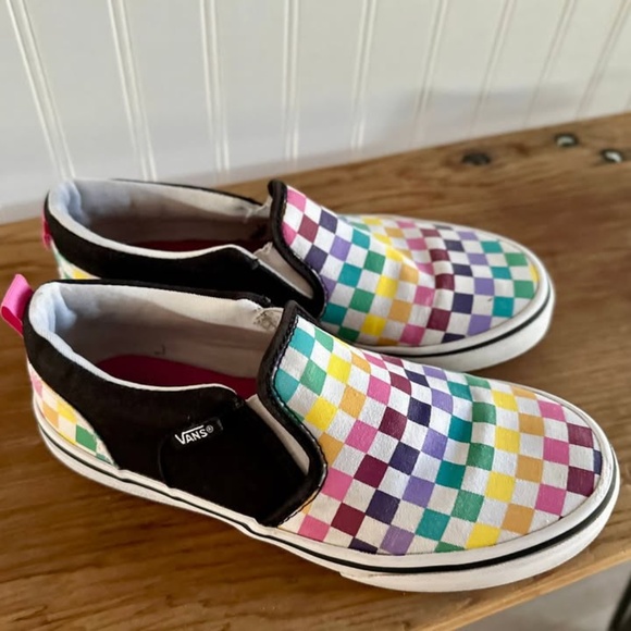 Vans Slip on Shoes Size 5 Multicolor Checkered Pattern Used- Fair Condition