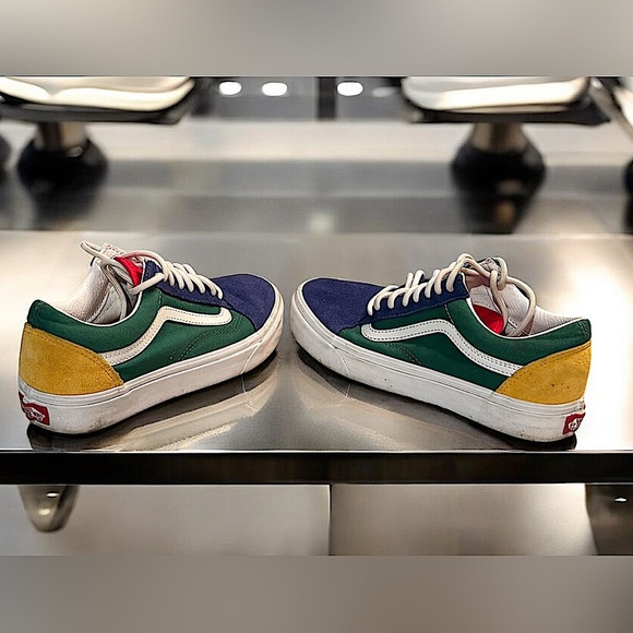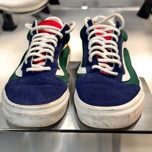 Vans low-top sneakers with a vibrant multicolor design. Features blue, green, yellow, and red accents.