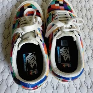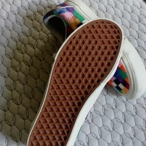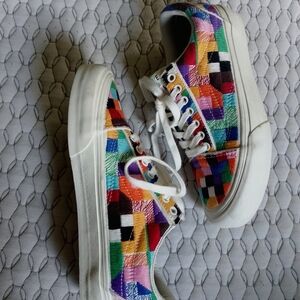 Vibrant Vans sneakers with a patchwork design. Features a mix of colors for a bold look. Comfortable and stylish for everyday wear. New with light storage scuffs.