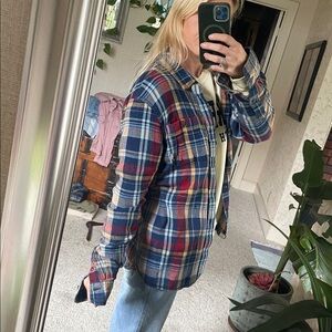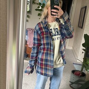 Vans shirt with a vibrant plaid pattern. Features blue, red, and yellow tones. Ideal for everyday style. Perfect fall flannel, great pre loved condition size medium