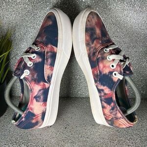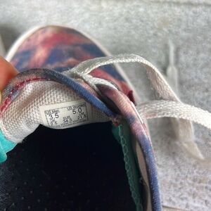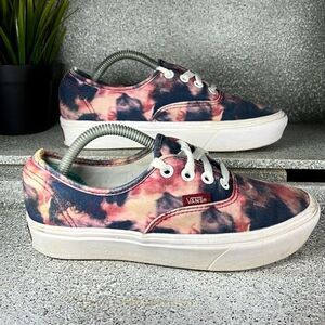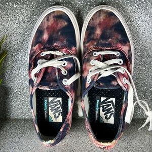Vibrant Vans sneakers with a multicolor tie-dye pattern. Features a classic white sole. Ideal for everyday style.
