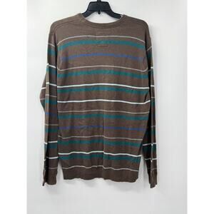 This Vans sweater is a men's XL size in brown, featuring a striped pattern and made of 100% cotton. It has a crew neck, long sleeves, and a tight-knit style. The pullover sweater is suitable for travel, casual wear, or work settings, with a lightweight design ideal for fall and winter. It includes Vans logo accents and is machine washable for easy care. Perfect for a classic beach or casual look.
