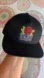 Black Vans hat with vibrant red rose and green leaves embroidery. Bold and stylish. Unisex