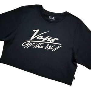 Elevate your casual style with this chic black Vans Off The Wall T-shirt. Designed with a trendy cropped fit and short sleeves, this top is perfect for a relaxed look. Made from comfortable cotton material and featuring a classic crew neckline, it's a versatile addition to your wardrobe that you can pair with any outfit.