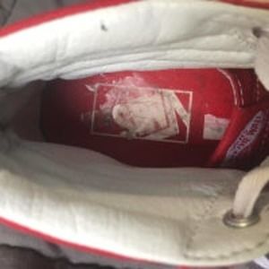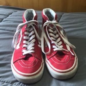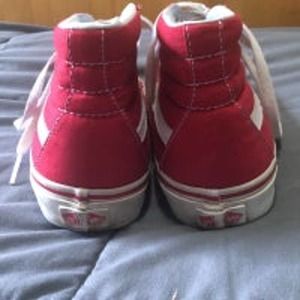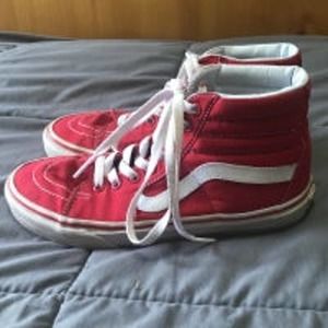 Vans off the wall Fillmore high top sneakers. Red shoes with white accents and laces. Men’s size 6, women’s size 7.5. Soles are in excellent condition with one mark noted in photo, white on shoes is bright and clean. Some sticker residue in one heal, but excellent used condition.