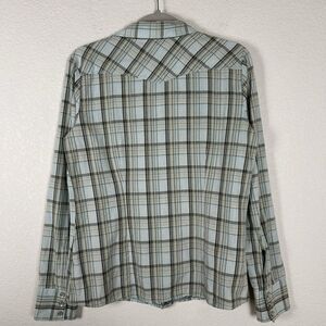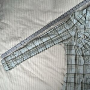 Gently used cotton plaid aqua and green with satin lined yoke and cuffs.