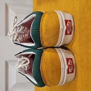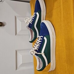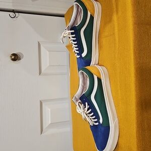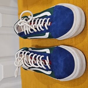 Introducing the Vans Men-Women Yacht Club Old Skool Sneakers in Blue/Green/Yellow/Red. These sneakers are 100% original and perfect for both men and women. They are ideal for athletic activities and come in a US shoe size of 7.5 Men's = 9 Women's.