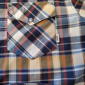 Vans Off The Wall plaid casual short sleeve mens shirt with pearl snap buttons and pockets. Pre owned in great conditions. Size Large