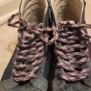 Stylish high-top sneakers in blue with purple accents. Features unique purple laces.