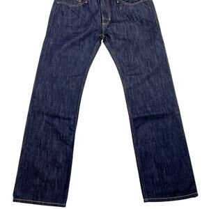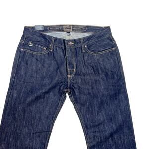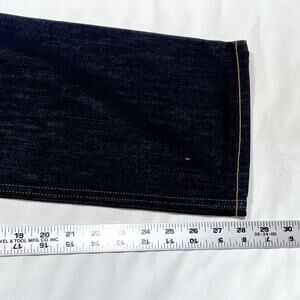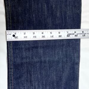 Introducing a pair of Vans Off the Wall Slimbo Denim Jeans in size 32x30, featuring a slim fit, low-rise style, in a dark blue color. Item is new with tags, it has minor damage with a tear approximately 1 inch long on one of the legs as shown in picture.