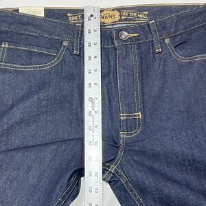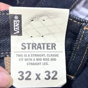Introducing a pair of Vans Off the Wall Strater Denim Jeans in size 32x32, featuring a straight fit, mid-rise style, in a dark blue color. Item is new with tags.