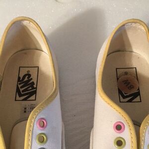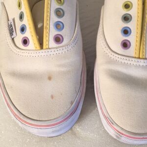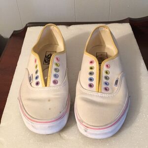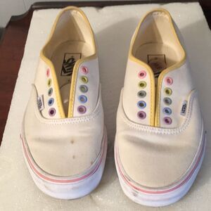 Stylish and comfortable, these Vans off the wall sneakers feature a cream color with colorful eyelets. Perfect for everyday wear.