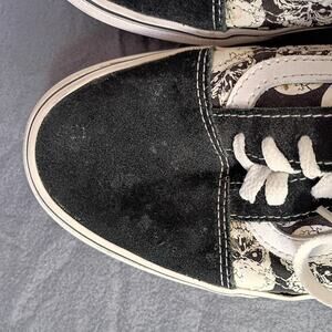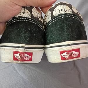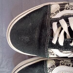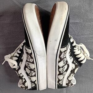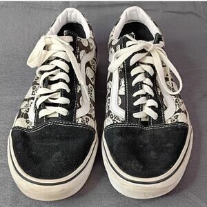 The product is a pair of Vans Old School Skulls Black White sneakers in size 10.5. These sneakers have a low top design, solid black color with glow in the dark skull accents, and are part of the Vans Old School product line. Made of leather with a medium width, these athletic shoes are perfect for men who appreciate the vintage style and unique glow in the dark feature. Ideal for casual wear and activity, these sneakers are a rare find for collectors and fans of the brand.