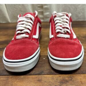 Unisex skater shoes / sneakers by Vans. Canvas and suede upper. Gum rubber outsole. Men's size 6.5 / Women's size 8. Light tread wear. Some wearing of the logo to the back heel with some dirt staining to the side soles. On one shoe, the rubber by the toe is pulling up a bit. One darkened stain to the right back heel. Made in Vietnam. Racing red and true white colorway.