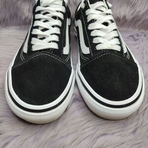 The product is a pair of Vans Old Skool Black Suede Popcush sneakers in men's size 5.5. These sneakers feature a low top design with a lace-up closure, made of black suede material. With a standard shoe width, these athletic shoes are suitable for activities like gym training, walking, and skateboarding. The Vans brand is known for its stylish and comfortable footwear, making these sneakers a popular choice for men looking for a versatile and trendy option.