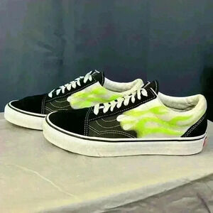 Vans Old Skool Black & White w/Green Flames Size 8 Men Size 9.5 Women. These super cool sneakers sure can make a statement they are in Excellent but Used Condition. Retail priced at $100 we are letting these super cool sneakers run away for just $40!! PRICE DROPPED!!! Get ‘em before I change my mind, just $25!!!