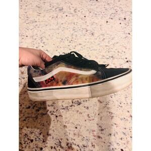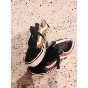 Style: Vans Old Skool ComfyCush with tie-dye / multicolor side panels and classic white stripe.