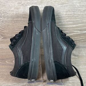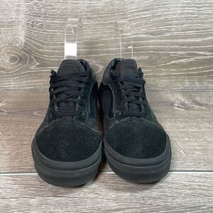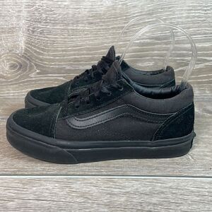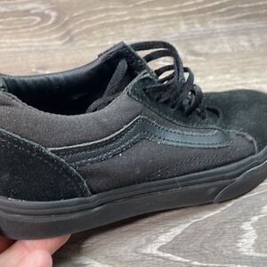 Vans Old Skool Low Top Little Boy Size 2 Black Suede Canvas Triple Black Shoe in very good condition. Great color way and terrific tread life left. No holes, rips or tears in the Canvas or Suede. Get these for your little boy or a girl today.