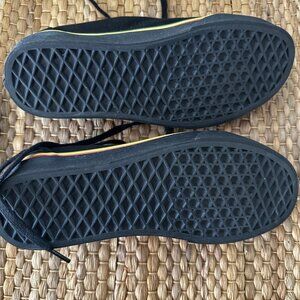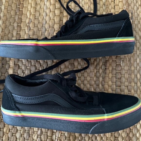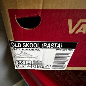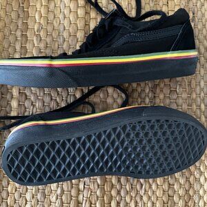 This pair of Vans Old Skool Rasta is in great condition. Worn only a few times and shows very little wear, if any at all. A canvas sneaker with a suede toe and rubber sole. Size Women's 6.5, Men's 5.0, and it comes in the original box.