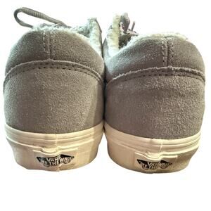 Vans Old Skool low-top sneakers in gray suede with beige leather side stripe and warm sherpa fleece lining. Men’s size 10.5 / Women’s 12. Lightly worn with minimal tread wear and clean uppers—see photos. A classic silhouette with cozy cold-weather style.