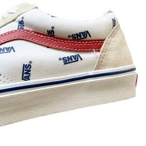Grab some iconic kicks with a fresh face lift, the Vans Old Skool Printed white, blue & red skate shoes. These fresh shoes come with a predominately white upper contrasted by red logo stripes on the sidewalls surrounded by logo script detailing in blue for a truly bold look. A vulcanized outsole improves flexibility for comfort and skate performance, while the padded footbed and collar will keep you comfy all day long.