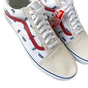 Vans shoes, vans sneakers, men’s vans, men’s 11.5 vans, patriotic, red white and blue shoes, Fourth of July, off white vans, cream vans, lace up vans, skate shoes, authentic, era vans, men’s vans with logo print, all over print, old school vans, old Skool vans, size 11.5