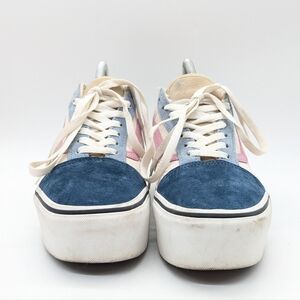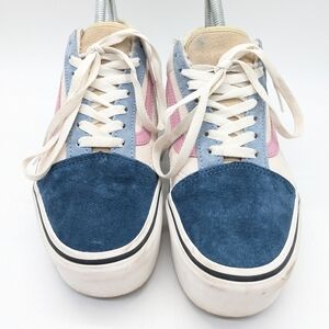 Vans Old Skool stackform pig suede sherpa lined platform tennis shoes 7.5. Men's 6, women's 7.5. Light wear/discoloration on the sole, some blue color transfer on the tongue, one small spot of lift on the toe (see photos). White, cream, pink, blue.