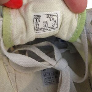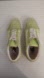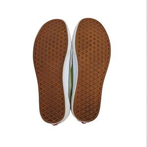 Old Skool style, in "Sharp Green" (a two- tone neon lime green), suede & canvas uppers. Classic white line, with white side walls. White lace up closures. Comfy, padded collars (white leather lined) & footbed. Classic brown rubber waffle soles. Unisex.