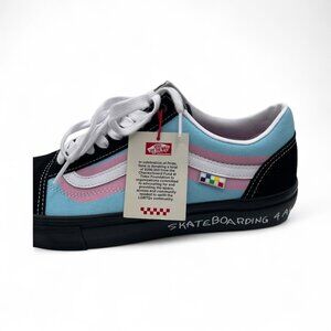 These Vans sneakers feature a pastel blue, pink, and black design with a rainbow flag logo and the message "SKATEBOARDING 4 ALL!" They celebrate Pride and support the LGBTQ+ community through the "Checkerboard Fund." (3000)