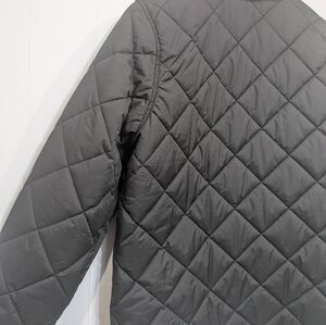 The Vans Quilted Puffer in Black, size Large, features a stylish diamond pattern and practical pockets, providing warmth and comfort. It is in good condition with only slight pilling on the sleeves and collar. The measurements are approximately 20 inches from armpit to armpit and 26 inches in length. The zipper operates smoothly, and it includes two convenient pockets.