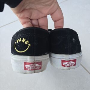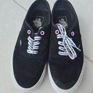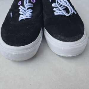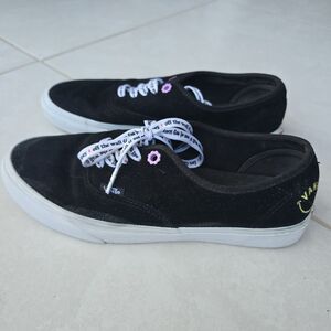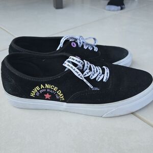 Vans Unisex Black Lace Up Skate Shoes. Womens Size 10, Men's Size 8.5. One side says Have a nice day. If you want to
