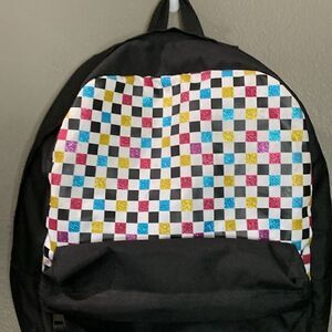 Vans Realm Classic Backpack School Laptop Bag Checkerboard Glitter Multi Very good used condition little wear Style number: VN0A48HGUX9 Material: 100% polyester Black multi color and glitter checkerboard design Zippered main compartment provides room for storing your everyday necessities Exterior zippered pocket on front Adjustable padded shoulder straps Haul loop at the top for an alternative carrying option Size approximately: 12" (L) x 16.5" (H) x 4" (D)