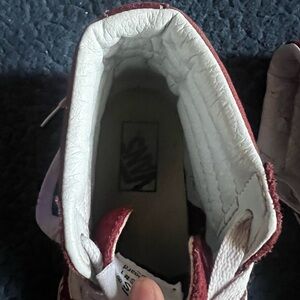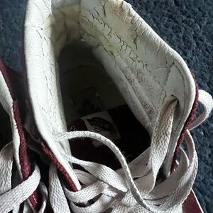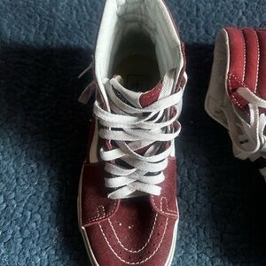 These Vans sneakers feature a classic burgundy and white color scheme with a distinctive waffle-like sole pattern that provides excellent traction. The rounded toe and slightly narrower middle section enhance the casual style, making them perfect for everyday wear. They are preowned with some wear in the inside but the outside and soles are in great condition.