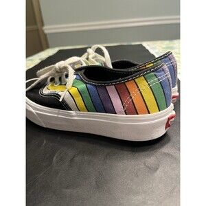 The Vans Refract Rainbow Skate Canvas Sneakers in women's size 5 are a colorful and stylish choice for casual or activewear. With a lace-up closure and cushioned comfort, these sneakers are perfect for walking, beach outings, skateboarding, or any other active pursuits. The multicolor rainbow design adds a fun and vibrant touch, while the classic Vans logo accents give them a timeless appeal. Made with fabric lining and canvas upper material, these sneakers are both durable and comfortable for all-day wear. Ideal for any season, these Vans sneakers are a must-have for your footwear collection.