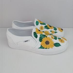 Vans SZ 8 White Customized Hand Painted Sunflower Motif Slip On Sneaker NEW