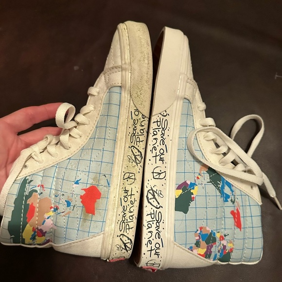 Durable high top save our planet themed high top vans sk8 sneakers. They have minimal wear but left sole has grass stains. Size 4 in men or kids and 5.5 in women.