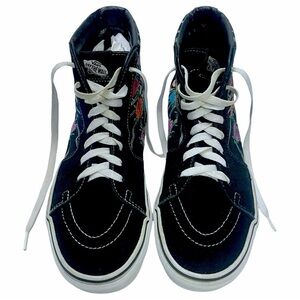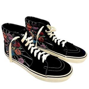 Pair of black high-top Vans Sk8-Hi sneakers with a Dia de Los Muertos (Day of the Dead) design. The shoes feature colorful sugar skulls and flowers embroidered on the sides and heels, and the iconic Vans Sidestrip.
