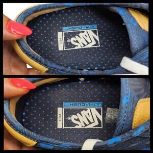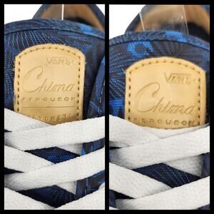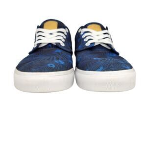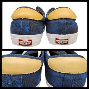 Good condition nearly new blue with beige tan details vans shoes in a mens 12. Tropical palm leaf canvas print. Faint wear overall, some wear specifically towards inside of insoles.