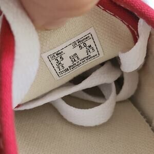 Good condition red and white Vans in a womens size 5. Some light faint discoloration on the exterior fabric, some white on the white bottom rubbers and faint wear on the insoles as shown in photos.