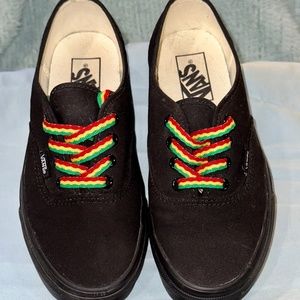 Excellent Used Condition, worn twice - Vans Authentic black on black with gum sole and rasta laces