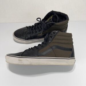 <Features> Vans Sk8 Hi Tops. Black leather with olive green canvas sides. The classic hi top vans with leather, not skated and in great condition.