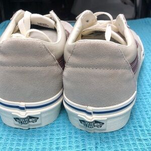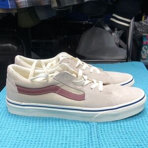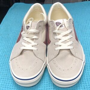 Experience the timeless style of Vans with these cream and red sneakers, featuring a signature Jazz Stripe and durable canvas upper. The classic low-top design and waffle pattern sole make them perfect for everyday wear.