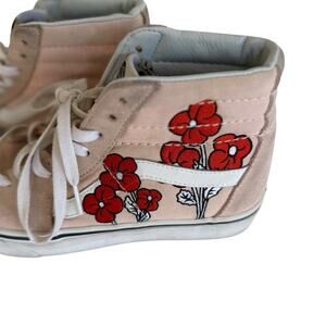 Celebrate Disney magic and skate style with these limited edition Disney x Vans Sk8-Hi High Top Sneakers in women’s size 7.5 (US). These blush pink suede sneakers feature a charming embroidered scene of Mickey giving Minnie a bouquet of red flowers on one side and blooming poppies on the other.