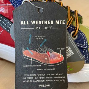 Made for adventure and advanced levels of day-to-day versatility, the all-new Sk8-Hi MTE-2 packs over 25 years of Vans snowboard boot history and technology into a timeless, trusted style. The MTE-2 feature set includes the new MTE-2 outsole built with All-Trac™, an exclusive all-weather rubber compound that offers significantly improved traction and flexibility for all types of weather. The HydroGuard™ 360o waterproof membrane is in place to keep you dry, a PrimaLoft® zonal insulation package for cold weather thermoregulation will keep you warm, and the molded UltraCush™ sockliner with an OrthoLite® topsheet has been designed to keep you comfortable. Plus, the durable water repellent-treated leather and textile uppers bring an iconic Vans aesthetic to this uncompromising cold weather comfort. Whether you find yourself bagging snowcapped peaks or braving a rain-soaked commute, you can set off with confidence knowing every stitch of your equipment is intentionally placed to provide ultimate versatility.