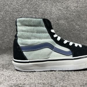 The product is a pair of Vans Sk8-Hi Mini Cord women's size 8 skate shoes in black and blue corduroy colorblock style. These lace-up sneakers are designed for athletic activities like skateboarding and are suitable for casual wear or activewear during the summer, fall, and spring seasons. The Vans Sk8-Hi model provides comfort and style for women who love the brand's iconic footwear.