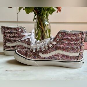 These high-top sneakers feature a multi-colored chunky glitter upper with the classic Vans Sidestripe. They are a slimmed-down version of the iconic Sk8-Hi silhouette and include a zipper closure on the heel for easy on and off.