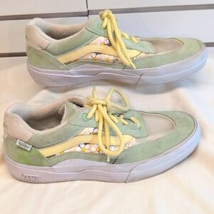 Keywords: Vans, Brighton, Skateboarding Shoes, Low Top Sneakers, Green Sneakers, Yellow Laces, Women's Shoes, Athletic Shoes, Casual Shoes, Skate Shoes, Size 10, Floral Accents, Suede Sneakers, Comfortable Shoes