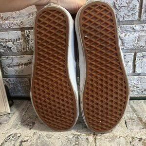 Vans Slip On Off The Wall Low Top Gray Skate Sneakers with brown leather detail at heel. GUC could use a little cleaning but in otherwise great condition.