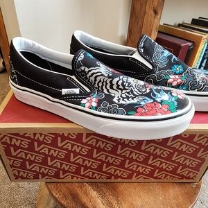 Vans slip-on shoes featuring a vibrant tiger and floral design. Black base with colorful accents. Sold out style! Men's 6/Women's 7.5.